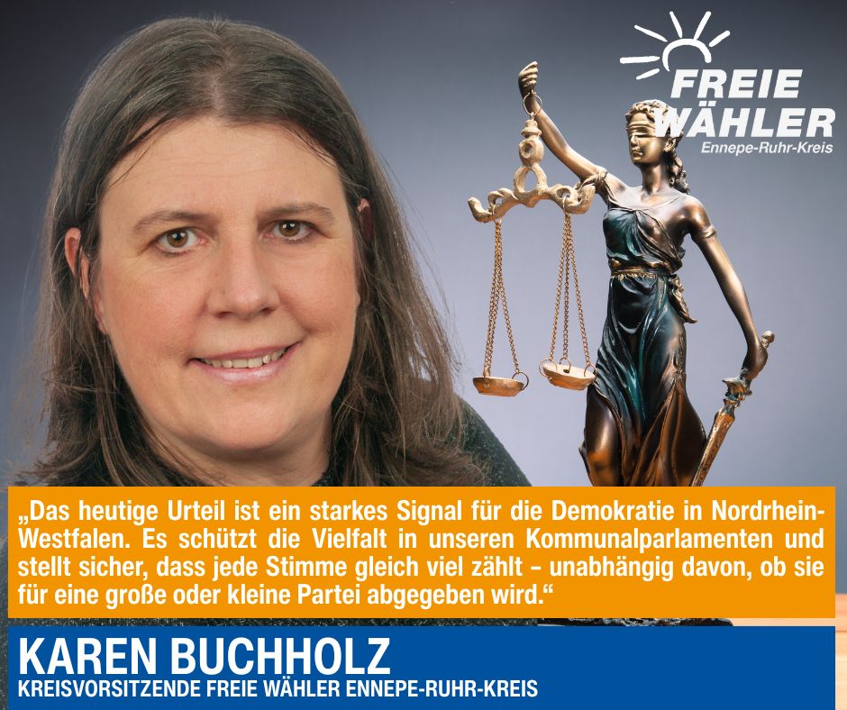 „Das heutige Urteil ist ein starkes Signal für die Demokratie in Nordrhein-Westfalen. Es schützt die Vielfalt in unseren Kommunalparlamenten und stellt sicher, dass jede Stimme gleich viel zählt – unabhängig davon, ob sie für eine große oder kleine Partei abgegeben wird“, erklärt die Kreisvorsitzende Karen Buchholz.