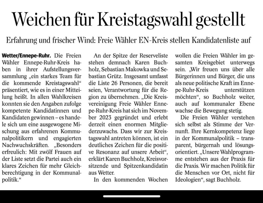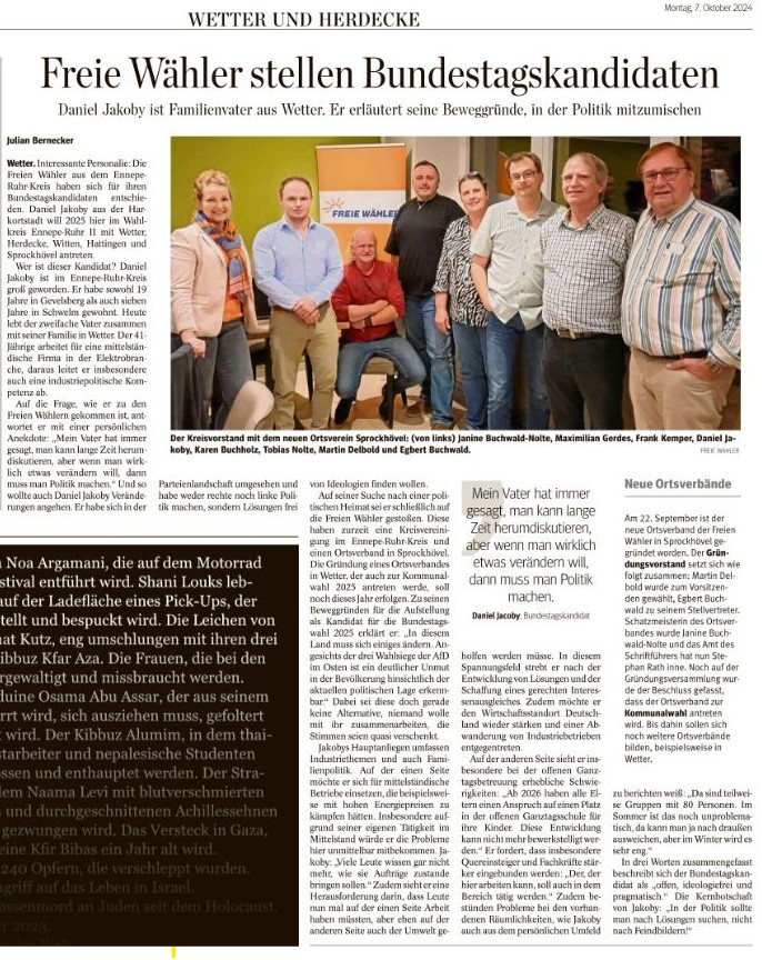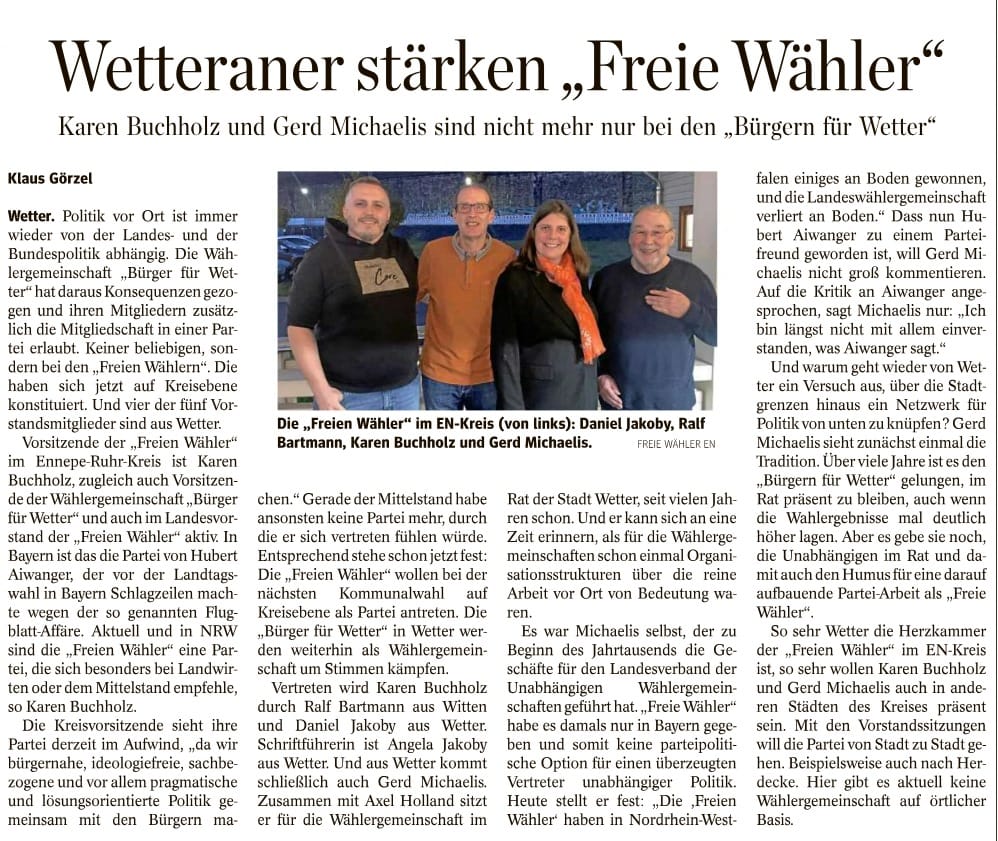 Am vergangenen Samstag trafen sich die FREIEN WÄHLER Ennepe-Ruhr, um wichtige Entscheidungen zu treffen. Begleitet wurde der .Abend von Maximilian Gerdes, dem stellv. Landesvorsitzenden der FREIEN WÄHLER NRW.