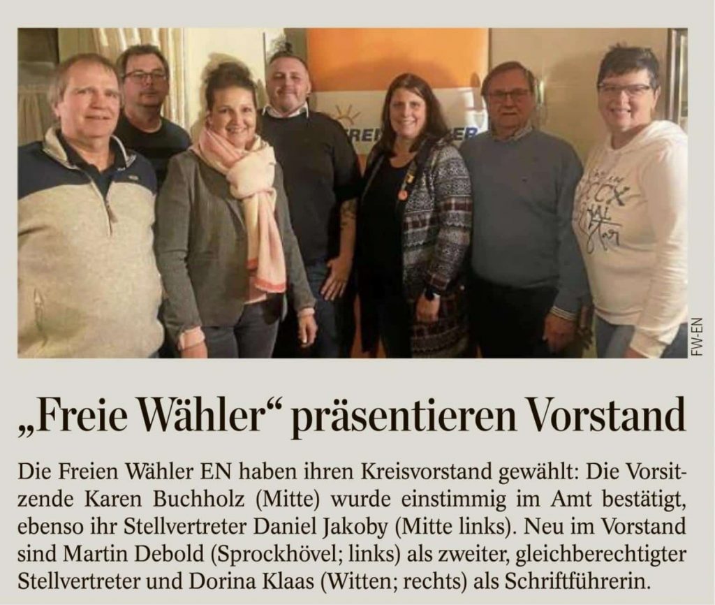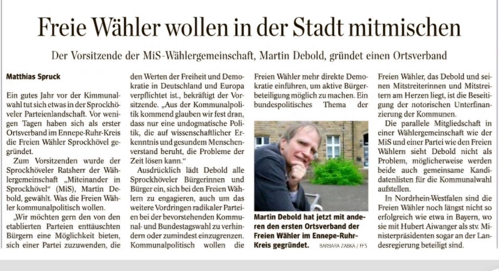 Zunächst wurde mit den FREIEN WÄHLERN Sprockhövel der erste Ortsverband der FREIEN WÄHLER im Ennepe-Ruhr-Kreis gegründet. Der Gründungsvorstand setzt sich wie folgt zusammen: Martin Debold wurde zum Vorsitzenden gewählt, Egbert Buchwald zu seinem Stellvertreter. Schatzmeisterin des Ortsverbandes wurde Janine Buchwald-Nolte und das Amt des Schriftführers hat nun Stephan Rath inne.